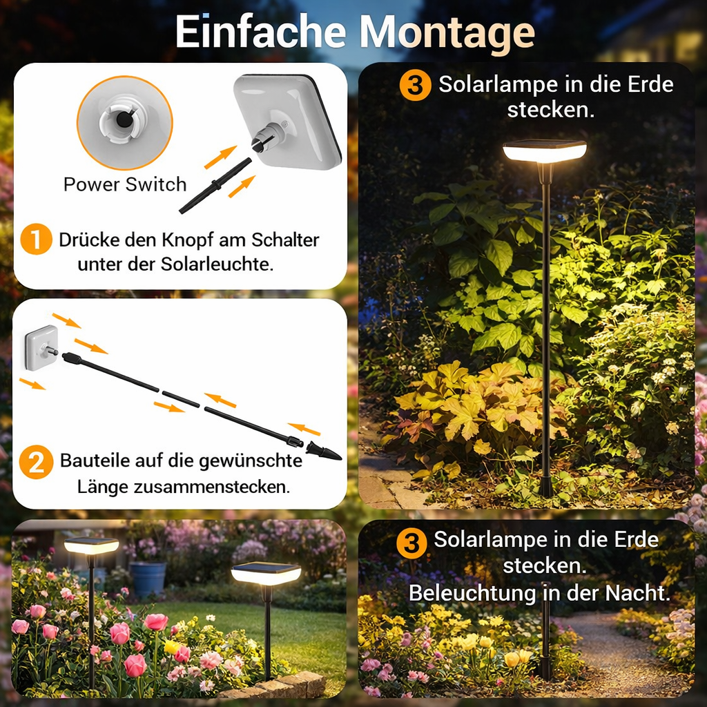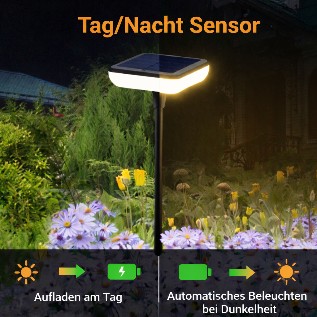Die Leuchten laden sich tagsüber automatisch per Solar auf und schalten sich bei Dämmerung selbstständig ein – komplett kabellos & wartungsfrei.