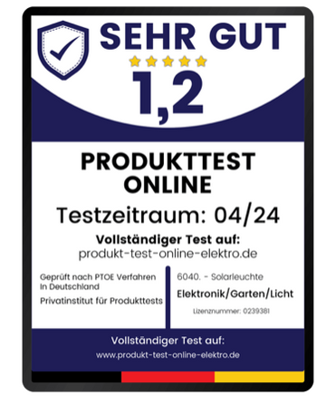 Die 60x40 Solarleuchte ist perfekt für den Außeneinsatz – sie ist wetterfest, widerstandsfähig gegen Regen, Schnee und Hitze. So sorgt sie das ganze Jahr über für zuverlässige Beleuchtung, egal bei welchem Wetter. Das garantieren wir auch mit einer 2 jährigen Produktgarantie. Zusätzlich sind all unsere Produkte vor jeder Produktion vom TÜV geprüft.